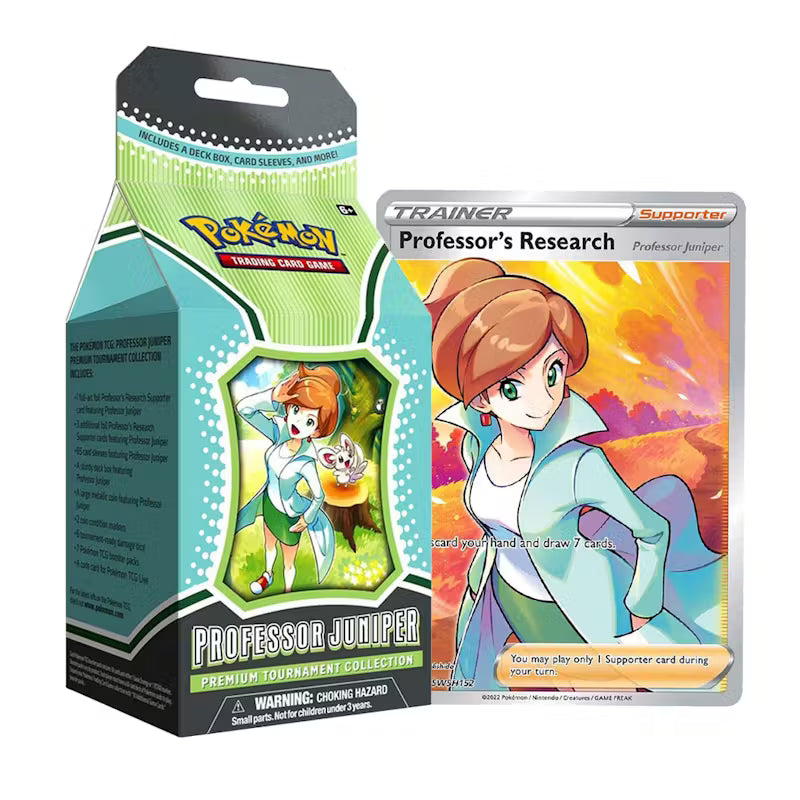 Professor Juniper guides new Pokémon Trainers as they begin their journey, and in the Pokémon TCG, her in-depth research can help you find the cards you need to succeed! In this premium collection, you get a full playset of the Professor’s Research Supporter card featuring Professor Juniper, plus a protective deck box, card sleeves, coin, and more tournament-ready accessories. You’ll also find a stack of Pokémon TCG booster packs and a code that unlocks another full playset of Professor’s Research in Pokémon TCG Live!
